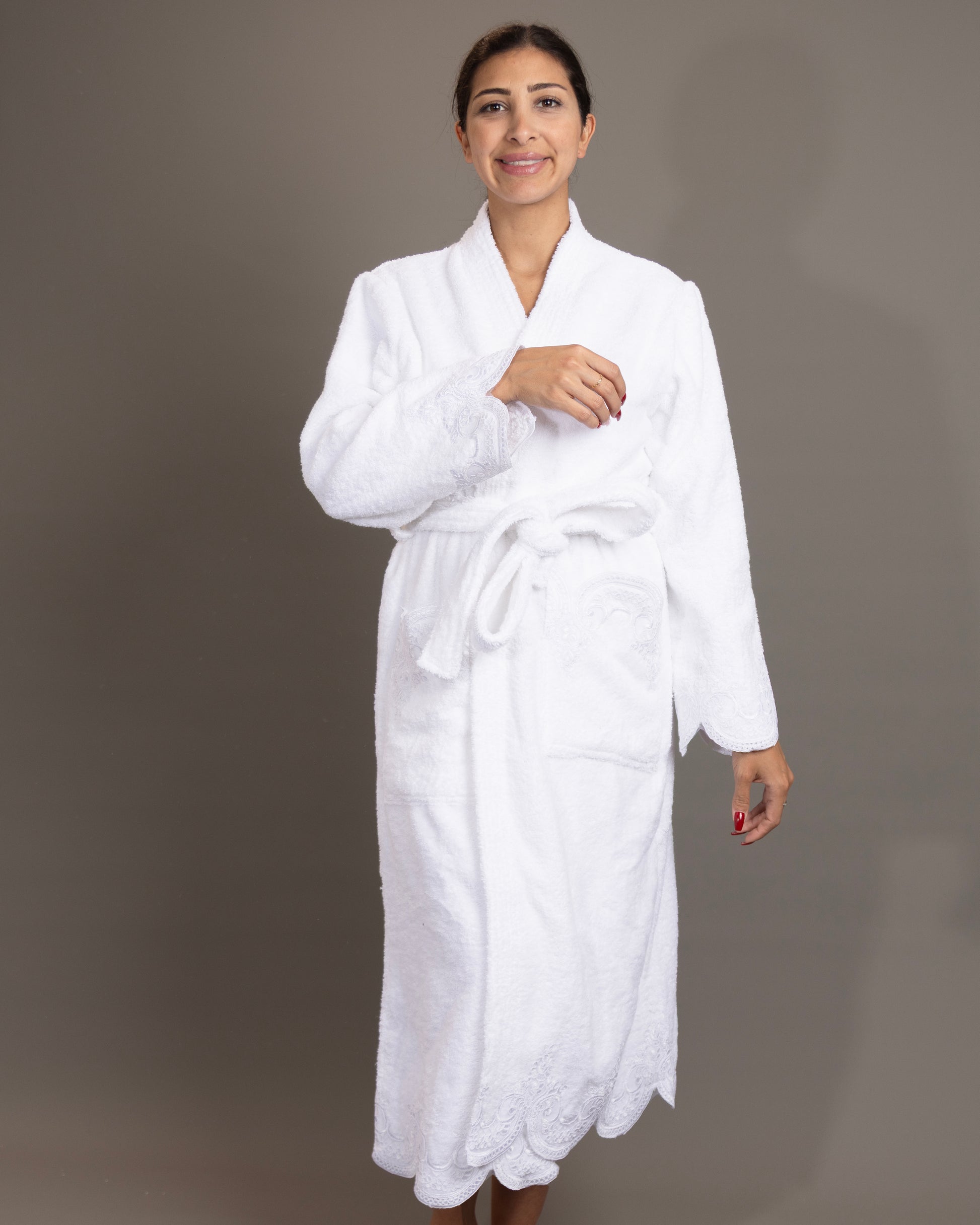 Elegant adult bathrobe featuring delicate lace trim. Crafted from premium soft cotton for maximum comfort and style. Perfect for daily wear or gifting.